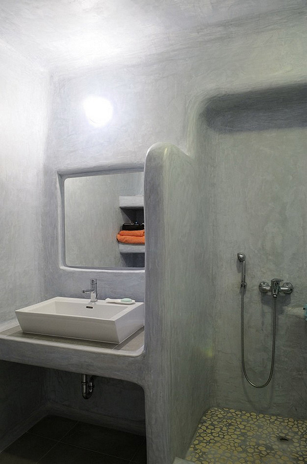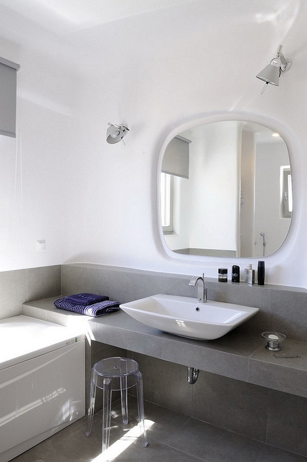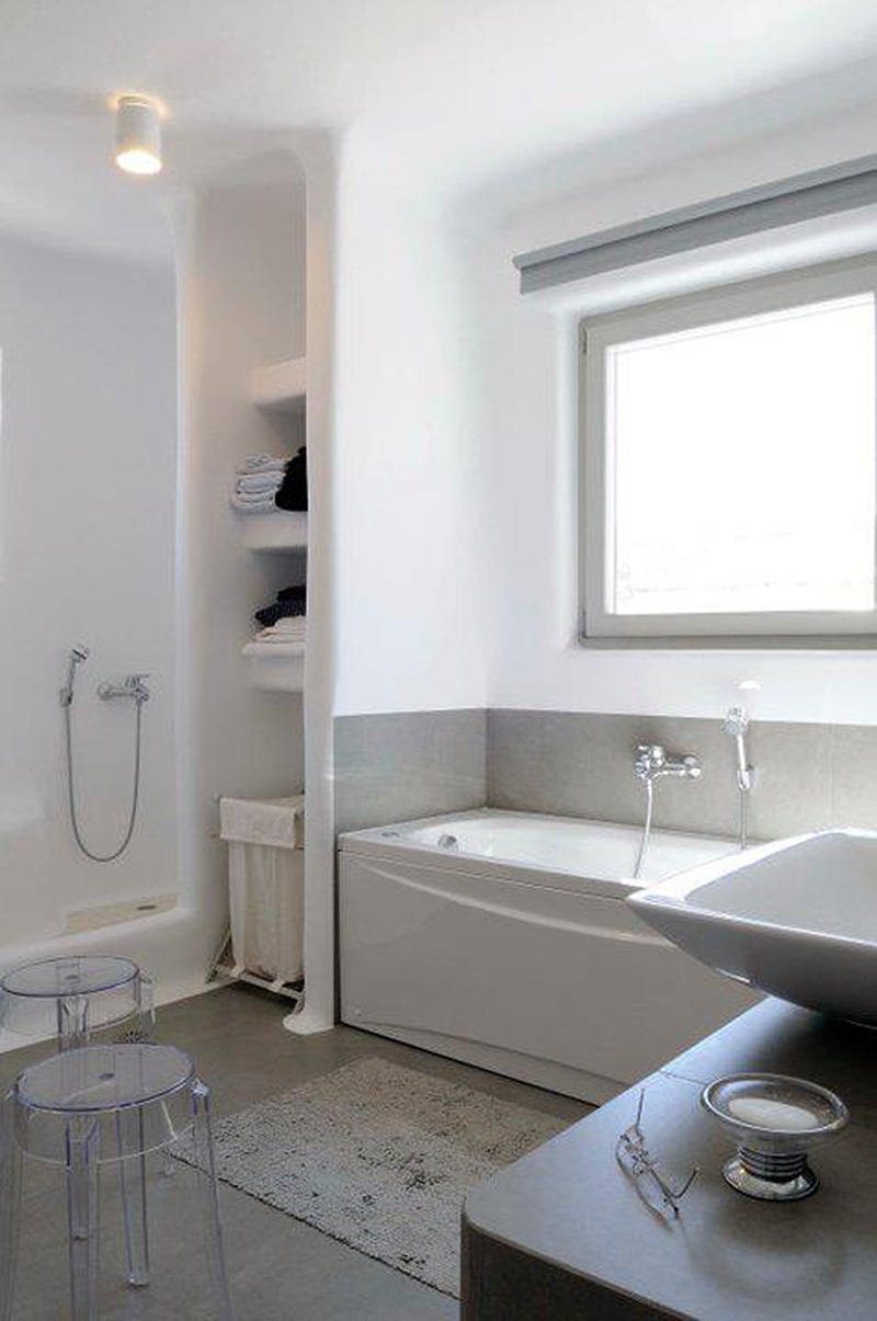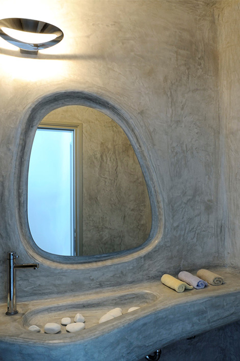 Al piano superiore, le camere e i bagni, in un gioco di colori bianchi e grigi, e con una lavorazione delle pareti della camera da letto principale che si ispira alle formazioni rocciose della spiaggia di Kolymbithres.