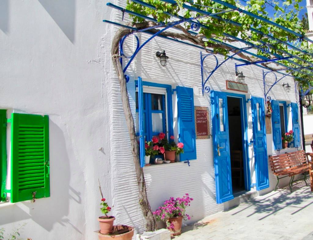 Se vi fermate tra i tavolini del ristorante Aranto, proprio all’ingresso del paese e frequentato da gente del posto, potrete gustare una cena a base di specialità prevalentemente di carne; e se andrete in gruppo, avrete modo di assaggiare più stuzzichini di vario tipo, come sono soliti fare i Greci con le loro mezedes (porzioni tipo “tapas”, che offrono un assaggio della cucina del posto).
